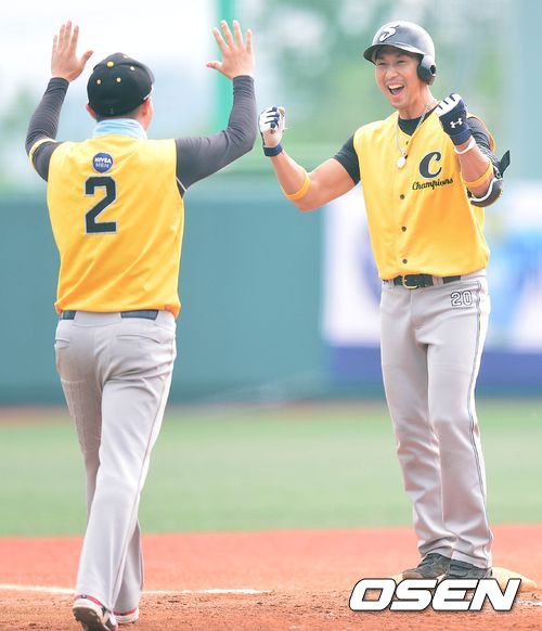 21일 오후 서울 구의야구장에서 '제4회 니베아 맨 컵 전국생활체육 야구대회' 챔피언스와 위저드의 결승전이 열렸다. 6회초 챔피언스 공격 2사 1, 2루 상황 5번타자 강경민이 2타점 3루타를 날리고 환호하고 있다.