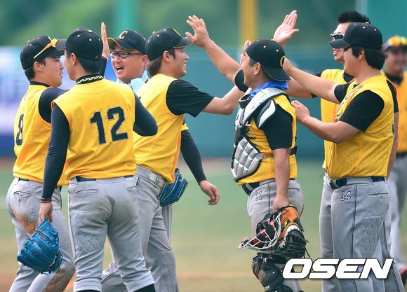 21일 오후 서울 구의야구장에서 '제4회 니베아 맨 컵 전국생활체육 야구대회' 챔피언스와 위저드의 결승전이 열렸다. 6회말 위저드 공격을 무실점으로 막은 챔피언스 투수 이희범이 더그아웃으로 들어오며 동료들의 환호를 받고 있다.