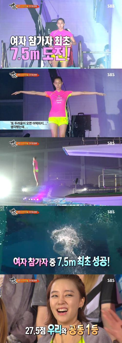 '맨친'의 유이가 여자 참가자 중 최초로 7.5m 다이빙에 성공했다.