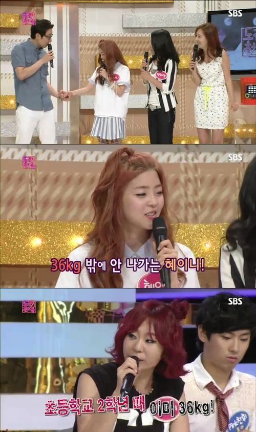 혜이니는 21일 오전 방송된 SBS '도전1000곡'에 출연, 그룹 오렌지캬라멜의 노래에 맞춰 댄스를 선보였다. MC 이휘재는 혜이니의 팔을 보고 "정말 날씬하다"라며 몸무게에 대해 물었고, 이에 혜이니는 "현재 몸무게가 36㎏ 정도 나간다"고 답해 주위를 술렁이게 했다. 이휘재는 "남자면 군면제다"라고 놀라워하기도.