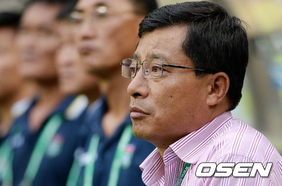 경기에 앞서 북한 김광민 감독이 그라운드를 바라보고 있다.