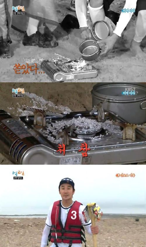21일 방송된 KBS 2TV '해피선데이-1박2일'에서는 지난주에 이어 전남 신안 임자도에서 '올드보이 스카우트 여름캠프'를 떠난 멤버들의 모습이 그려진 가운데, 엄태웅이 급한 마음에 모래밭에 씻은 쌀을 쏟아버리는 모습이 전파를 탔다.