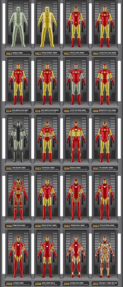 사진 속에는 지난 1963년 첫 선을 보인 아이언맨 슈트부터 2013년 최신판 아이언맨 슈트까지 다양한 모양을 한 곳에 모아둬 더욱 관심을 모았다.