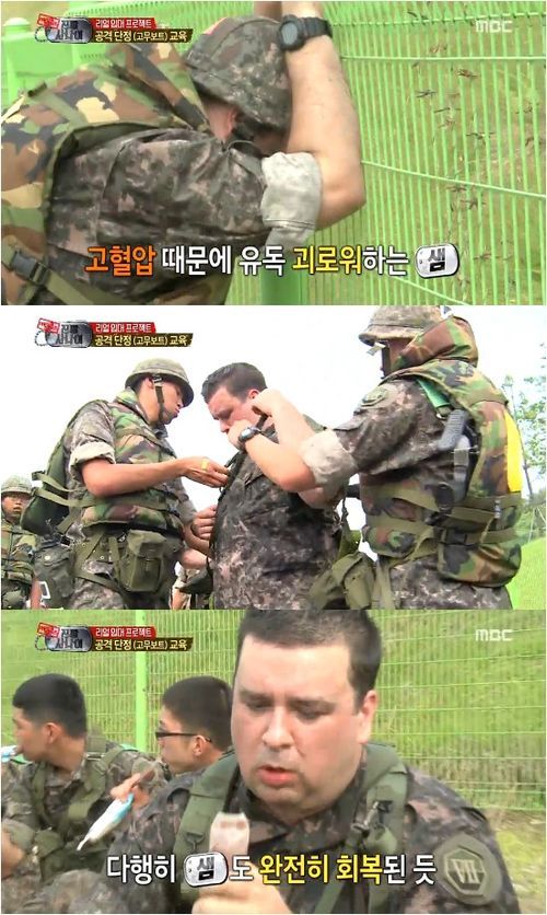 샘 해밍턴은 21일 방송된 MBC 예능프로그램 ‘일밤-진짜 사나이’에서 고무보트 훈련인 공격단정 훈련을 받다가 고혈압 증세로 인해 힘들어했다. 숨 쉬기도 힘들어 하는 모습에 더운 날씨를 고려해 훈련이 중단됐다.