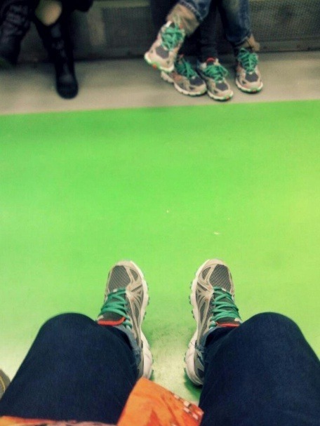 이 사진에는 전철을 타고 있는 한 사람이 자신의 운동화가 나온 하체를 찍은 사진이다. 그런데 사진을 자세히 보면 사진을 찍은 사람 바로 앞에 앉아 있는 커플의 운동화가 보이면서 웃음을 자아낸다. 건너편 커플이 주인공과 같은 디자인을 하고 있기 때문이다.
