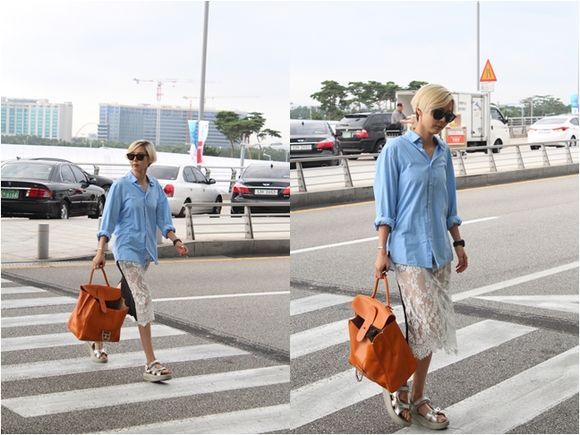 김나영은 지난 19일 오전 인천공항에서 센스 넘치는 패션 감각으로 주목을 받았다. 그는 오버 사이즈의 청남방에 섹시한 레이스 시스루 스커트로 포인트를 줘 특유의 센스 넘치는 패션을 완성했다.
