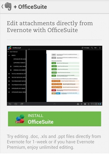 안드로이드 스마트폰이나 태블릿에 에버노트와 오피스스위트를 모두 설치해 놓을 경우, 한 번의 탭으로 중요한 문서를 편집하고 업데이트를 할 수 있다. 맥 또는 PC에서 생성한 문서, 스프레드시트, 프레젠테이션 파일 등은 에버노트 노트에 첨부해 안드로이드 기기에 설치된 에버노트와 동기화를 하면 된다.