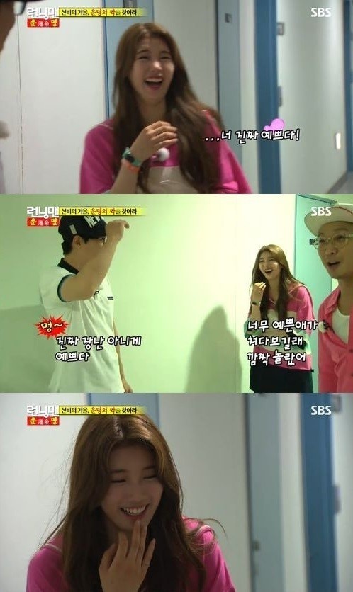 수지를 찾다가 유재석과 함께 있게 된 하하는 한참 수지의 얼굴을 보더니 “너 왜 이렇게 예쁘냐”고 감탄했다. 이 때 수지를 멍하니 쳐다보고 있던 유재석도 “진짜 장난 아니게 예쁘다”고 말했고 하하도 “너무 예쁜 애가 쳐다 보길래 깜짝 놀랐다”고 말해 웃음을 자아냈다.