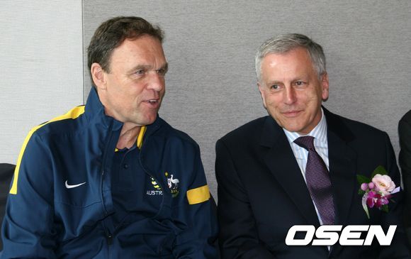 오지크 호주 대표팀 감독과 빌 패터슨 호주 대사가 나란히 앉아 담소를 나누고 있다.