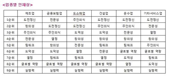 한편, 각 기업이 원하는 인재상은 기업이 속한 업종에 따라 차이를 보였다. 제조업과 운수업은 ‘도전정신’을 첫 손에 꼽은 반면, 금융보험업은 ‘전문성’을, 도소매업은 ‘주인의식’을 핵심역량으로 가장 많이 꼽았다. 건설업은 ‘도전정신’, ‘도덕성’, ‘주인의식’ 세 가지 항목 모두를 중시하고 있었다.