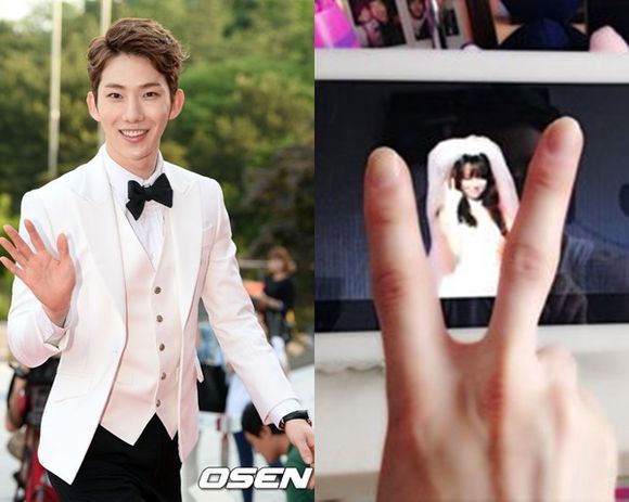사진 속에서 조권은 이정현이 쇼케이스에서 손가락으로 브이자 그리고 있는 모습을 보면서 자신도 똑같이 브이자를 그리고 있다.