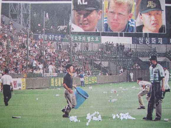 그 대목에서 성난 대구 관중들은 물병이나 깡통, 휴지 뭉치 따위를 가리지 않고 그라운드로 마구 집어던졌다. 그러잖아도 속이 상해 있던 관중들을 자극했으니 그냥 넘어갈리 만무했다.
