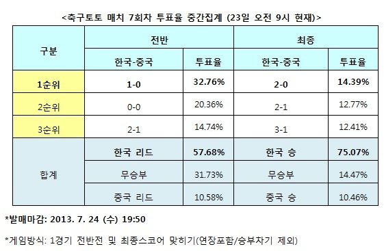 [축구토토] 국민체육진흥공단(www.kspo.or.kr)이 발행하는 체육진흥투표권 수탁사업자 스포츠토토의 공식 온라인 발매 사이트 베트맨(www.betman.co.kr)이 오는 24일 오후 8시 화성종합경기타운에서 열리는 동아시안컵 두번째 매치인 한국-중국전을 대상으로 한 축구토토 매치 7회차 투표율 중간집계 결과, 전체 참가자의 75.07%는 한국의 승리를 전망했다고 밝혔다.