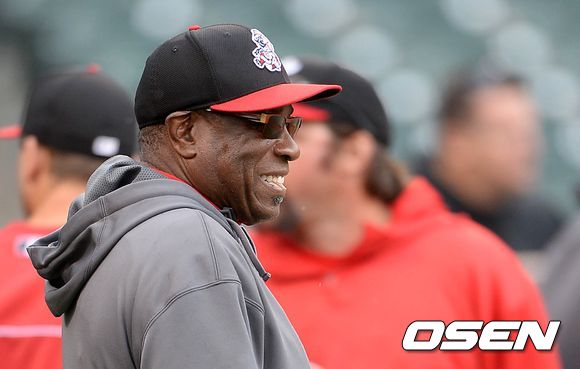 23일(한국시간) 미국 캘리포니아주 샌프란시스코에서 열린 2013 메이저리그 샌프란시스코 자이언츠와 신시내티 레즈의 경기, 경기에 앞서 신시내티 더스티 베이커 감독이 훈련 중인 선수들을 바라보고 있다.