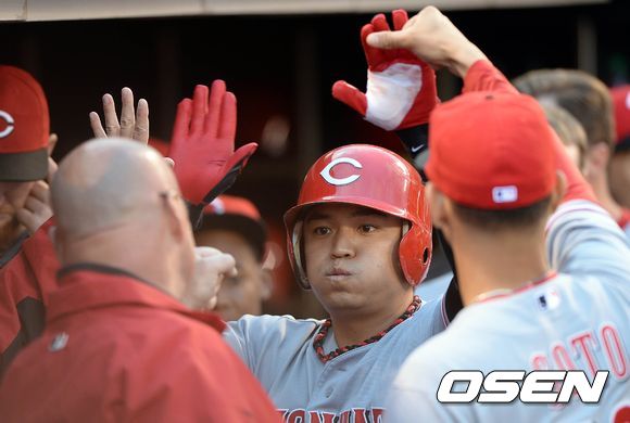23일(한국시간) 미국 캘리포니아주 샌프란시스코에서 열린 2013 메이저리그 샌프란시스코 자이언츠와 신시내티 레즈의 경기, 2회초 1사에서 신시내티 추신수가 좌월 솔로 홈런을 치고 덕아웃에서 동료들과 환호하고 있다.