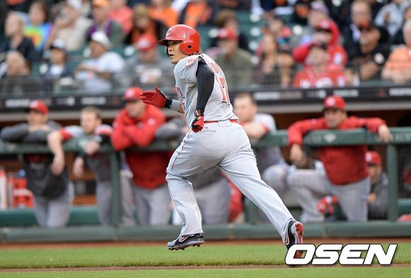 23일(한국시간) 미국 캘리포니아주 샌프란시스코에서 열린 2013 메이저리그 샌프란시스코 자이언츠와 신시내티 레즈의 경기, 1회초 무사에서 신시내티 추신수가 좌전 2루타를 치고 그라운드를 달리고 있다.