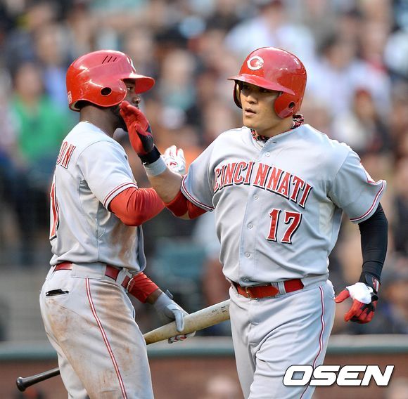 23일(한국시간) 미국 캘리포니아주 샌프란시스코에서 열린 2013 메이저리그 샌프란시스코 자이언츠와 신시내티 레즈의 경기, 2회초 1사에서 신시내티 추신수가 좌월 솔로 홈런을 치고 홈에서 브루스와 환호하고 있다.