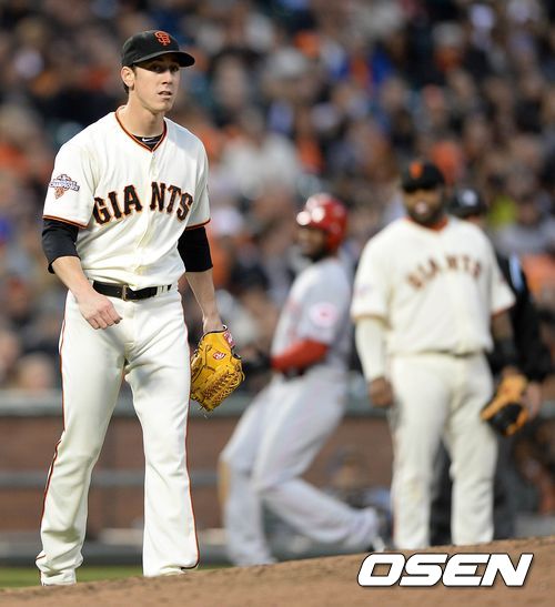 23일(한국시간) 미국 캘리포니아주 샌프란시스코에서 열린 2013 메이저리그 샌프란시스코 자이언츠와 신시내티 레즈의 경기, 4회초 2사 1루에서 샌프란시스코 린스컴이 신시내티 보토에게 우전안타를 혀용하고 아쉬워하고 있다.