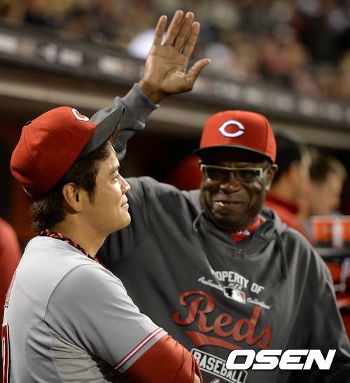 23일(한국시간) 미국 캘리포니아주 샌프란시스코에서 열린 2013 메이저리그 샌프란시스코 자이언츠와 신시내티 레즈의 경기, 신시내티 더스티 베이커 감독이 덕아웃에서 추신수와 이야기를 나누며 웃고 있다.