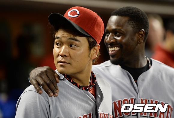 23일(한국시간) 미국 캘리포니아주 샌프란시스코에서 열린 2013 메이저리그 샌프란시스코 자이언츠와 신시내티 레즈의 경기, 신시내티 브랜든 필립스가 덕아웃에서 추신수와 이야기를 나누며 웃고 있다.