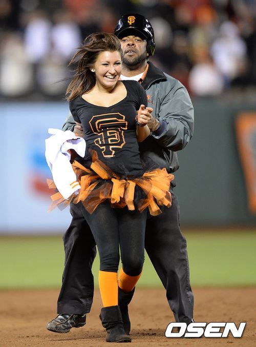 9회말 경기장에 난입한 여성 관객이 안전요원에 의해 경기장을 나가고 있다. /sunday@osen.co.kr