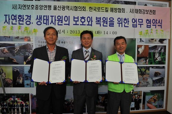 박재줄 태화강보전회 상임대표, 강창희 한국로드킬 예방협회 상임대표, 김정구 자연보호중앙연맹 울산광역시협의회 회장(왼쪽부터)./현대자동차 제공.