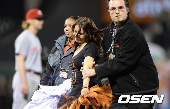 9회말 경기장에 난입한 여성 관중이 안전요원에 의해 경기장 밖으로 나가고 있다. /sunday@osen.co.kr