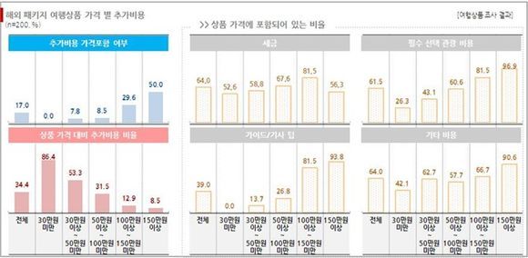 36개 여행사, 중국/동남아 패키지 여행상품 200개를 대상으로 실시한 여행사 사전정보 제공 실태조사에 따르면 상품가격에 세금, 가이드/기사 팁, 선택관광 비용 등 추가비용이 모두 포함된 상품은 17%에 그쳤으며상품가격 대비 추가비용 비율이 평균 34.4%에 이르는 것으로 나타났다.