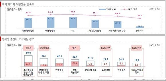 최근 2년 이내 해외 패키지 여행상품을 구입한 소비자 500명을 대상으로 실시한 온라인 설문조사에 따르면, 패키지 여행상품에 대한 전반적 만족도는 54.2%로 나타났으며 항목별로는 여행지/일정(57.3%), 숙소(57.3%)에 대한 만족도가 높은 반면, 가이드/인솔자(48.3%), 상품정보 제공수준(43.1%)에 대한 만족도는 타 항목 대비 상대적으로 낮은 편으로 조사됐다.