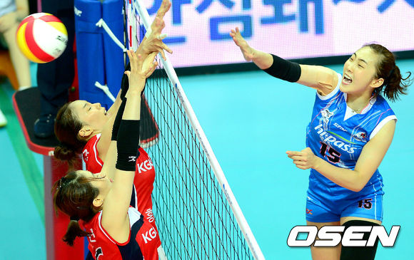 23일 오후 경기도 안산시 상록수체육관에서 열린 '2013 안산-우리카드컵 프로배구대회' 여자부 도로공사-KGC 인삼공사의 경기, 2세트 한국도로공사 황민경이 스파이크 공격을 시도하고 있다.