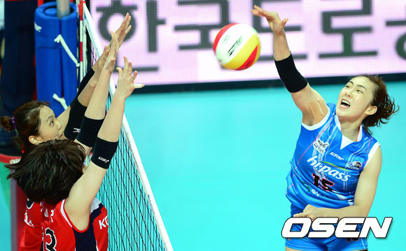 23일 오후 경기도 안산시 상록수체육관에서 열린 '2013 안산-우리카드컵 프로배구대회' 여자부 도로공사-KGC 인삼공사의 경기, 2세트 한국도로공사 황민경이 스파이크 공격을 시도하고 있다.