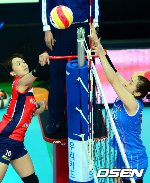23일 오후 경기도 안산시 상록수체육관에서 열린 '2013 안산-우리카드컵 프로배구대회' 여자부 도로공사-KGC 인삼공사의 경기, 2세트 한국인삼공사 최수빈이 블로킹을 피해 공격을 시도하고 있다.