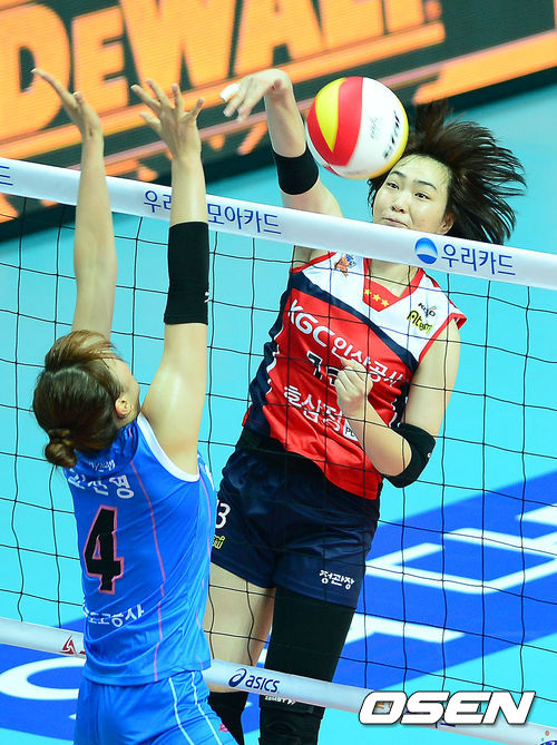 23일 오후 경기도 안산시 상록수체육관에서 열린 '2013 안산-우리카드컵 프로배구대회' 여자부 도로공사-KGC 인삼공사의 경기, 1세트 한국인삼공사 유미라가 한국도로공사 김선영의 블로킹을 피해 대각선 공격을 시도하고 있다.