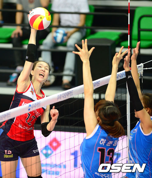 23일 오후 경기도 안산시 상록수체육관에서 열린 '2013 안산-우리카드컵 프로배구대회' 여자부 도로공사-KGC 인삼공사의 경기, 4세트 한국인삼공사 백목화가 공격을 시도하고 있다.