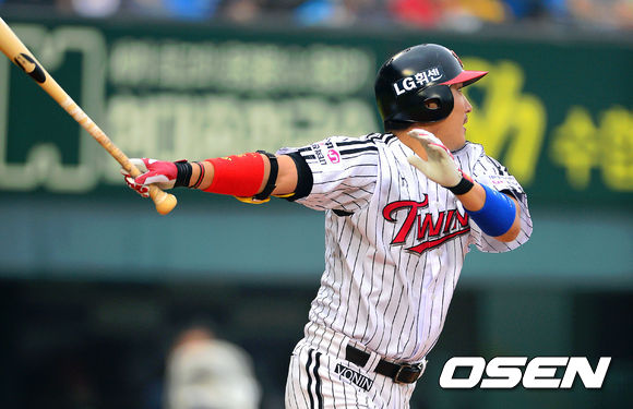 23일 오후 서울 잠실구장에서 열린 2013 한국야쿠르트 세븐프로야구 LG 트윈스와 KIA 타이거즈의 경기, 1회말 1사 2루 LG 이진영이 선취 1타점 적시타를 날리고 있다.