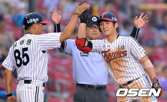 23일 오후 서울 잠실구장에서 열린 2013 한국야쿠르트 세븐프로야구 LG 트윈스와 KIA 타이거즈의 경기, 2회말 1사 2,3루 LG 오지환이 2타점 적시타를 날린 후 최태원 코치와 하이파이브를 하고 있다