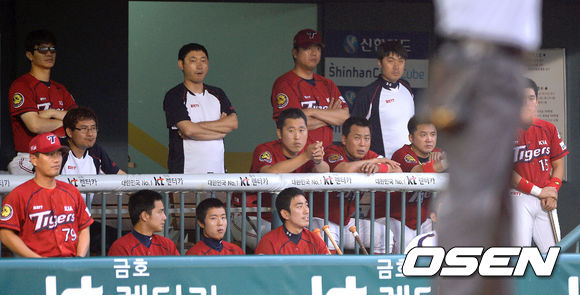 23일 오후 서울 잠실구장에서 열린 2013 한국야쿠르트 세븐프로야구 LG 트윈스와 KIA 타이거즈의 경기, 1~2이닝 동안 6실점 허용한 KIA 선수들이 안타까운 표정으로 경기를 지켜보고 있다.