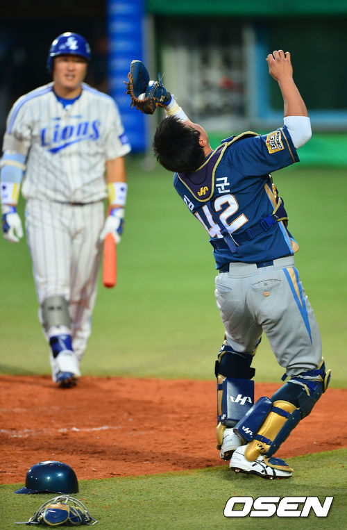 23일 오후 대구시민구장에서 열린 2013 한국야쿠르트 세븐프로야구 삼성 라이온즈와 NC 다이노스의 경기, 3회말 1사 주자 2루 삼성 최형우의 플라이 타구를 NC 김태군 포수가 잡아내고 있다.