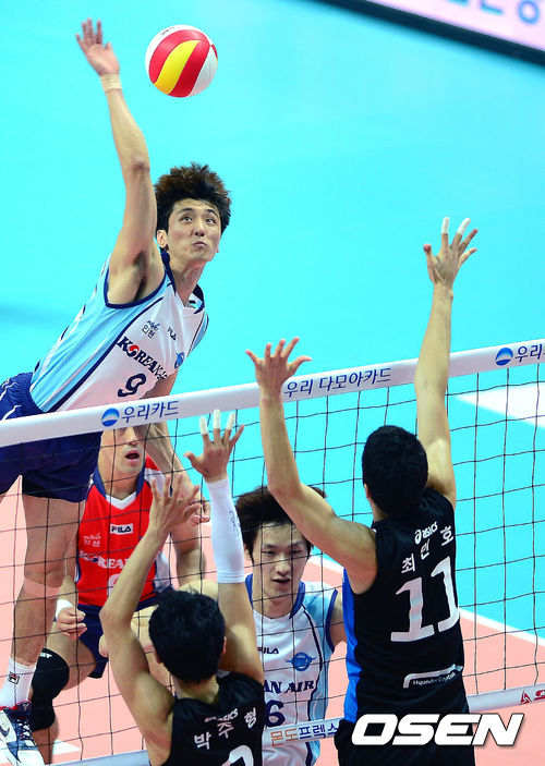 23일 오후 경기도 안산시 상록수체육관에서 열린 '2013 안산-우리카드컵 프로배구대회' 남자부 대한항공-현대캐피탈의 경기, 1세트 대한항공 곽승석이 강 스파이크를 때리고 있다.