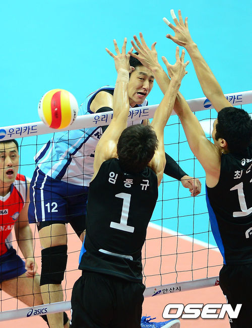 23일 오후 경기도 안산시 상록수체육관에서 열린 '2013 안산-우리카드컵 프로배구대회' 남자부 대한항공-현대캐피탈의 경기, 1세트 대한항공 장광균이 블로킹을 피해 대각선 공격을 시도하고 있다.
