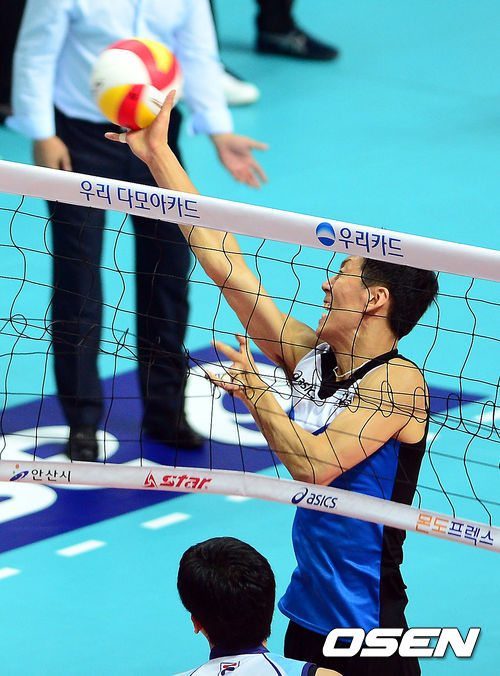 23일 오후 경기도 안산시 상록수체육관에서 열린 '2013 안산-우리카드컵 프로배구대회' 남자부 대한항공-현대캐피탈의 경기, 2세트 현대캐피탈 윤봉우가 블로킹을 시도하다 손가락이 네트에 걸렸다.