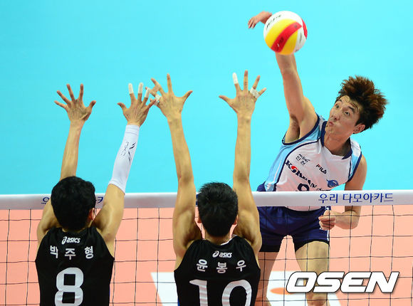 23일 오후 경기도 안산시 상록수체육관에서 열린 '2013 안산-우리카드컵 프로배구대회' 남자부 대한항공-현대캐피탈의 경기, 1세트 대한항공 곽승석이 스파이크를 때리고 있다.