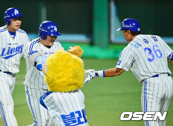 23일 오후 대구시민구장에서 열린 2013 한국야쿠르트 세븐프로야구 삼성 라이온즈와 NC 다이노스의 경기, 6회 무사 1루서 삼성 최형우가 NC 선발 찰리 쉬렉의 4구째를 공략해 135m 짜리 우월 투런 아치를 터트렸다. 시즌 17호째. 최형우가 홈을 밟은 후 이승엽과 하이파이브를 하고 있다.
