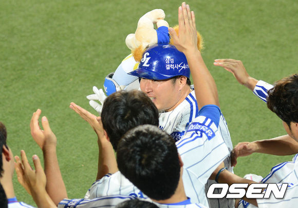 23일 오후 대구시민구장에서 열린 2013 한국야쿠르트 세븐프로야구 삼성 라이온즈와 NC 다이노스의 경기, 6회 무사 1루서 삼성 최형우가 NC 선발 찰리 쉬렉의 4구째를 공략해 135m 짜리 우월 투런 아치를 터트렸다. 시즌 17호째. 최형우가 덕아웃에서 동료들과 기쁨을 나누고 있다.