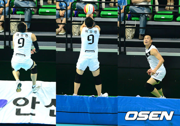 23일 오후 경기도 안산시 상록수체육관에서 열린 '2013 안산-우리카드컵 프로배구대회' 남자부 대한항공-현대캐피탈의 경기, 2세트 현대캐피탈 여오현이 몸을날려 공을 살려내고 있다.