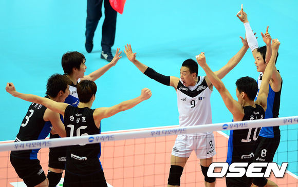 23일 오후 경기도 안산시 상록수체육관에서 열린 '2013 안산-우리카드컵 프로배구대회' 남자부 대한항공-현대캐피탈의 경기, 2세트 득점을 올린 현대캐피탈 선수들이 기뻐하고 있다.
