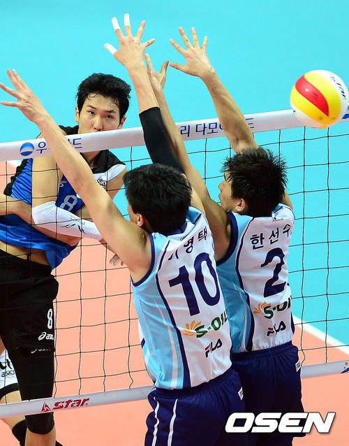 23일 오후 경기도 안산시 상록수체육관에서 열린 '2013 안산-우리카드컵 프로배구대회' 남자부 대한항공-현대캐피탈의 경기, 2세트 현대캐피탈 박주형이 공격을 시도하고 있다.