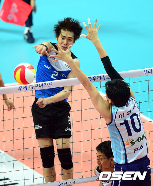 23일 오후 경기도 안산시 상록수체육관에서 열린 '2013 안산-우리카드컵 프로배구대회' 남자부 대한항공-현대캐피탈의 경기, 2세트 현대캐피탈 강선수가 대각선 공격을 시도하고 있다.