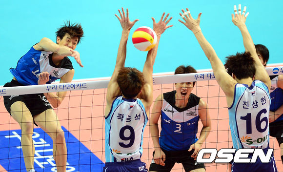 23일 오후 경기도 안산시 상록수체육관에서 열린 '2013 안산-우리카드컵 프로배구대회' 남자부 대한항공-현대캐피탈의 경기, 2세트 현대캐피탈 송준호가 블로킹을 피해 공을 넘기고 있다.