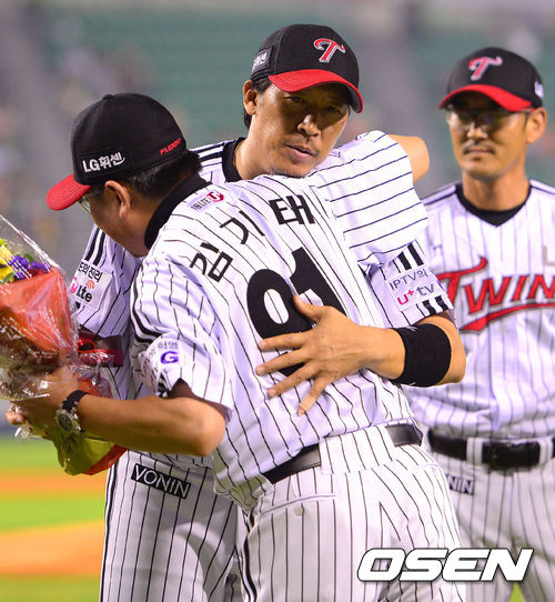 23일 오후 서울 잠실구장에서 열린 2013 한국야쿠르트 세븐프로야구 LG 트윈스와 KIA 타이거즈의 경기, 5회말 종료 후 클리닝 타임때 LG 이병규가 사이클링, 10연타석 안타 신기록 시상식을 가지고 있다.